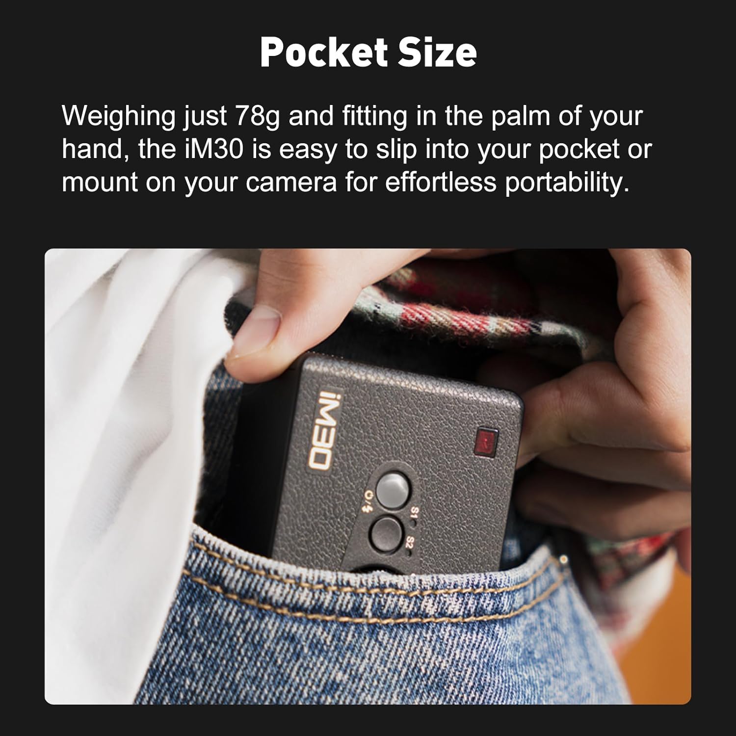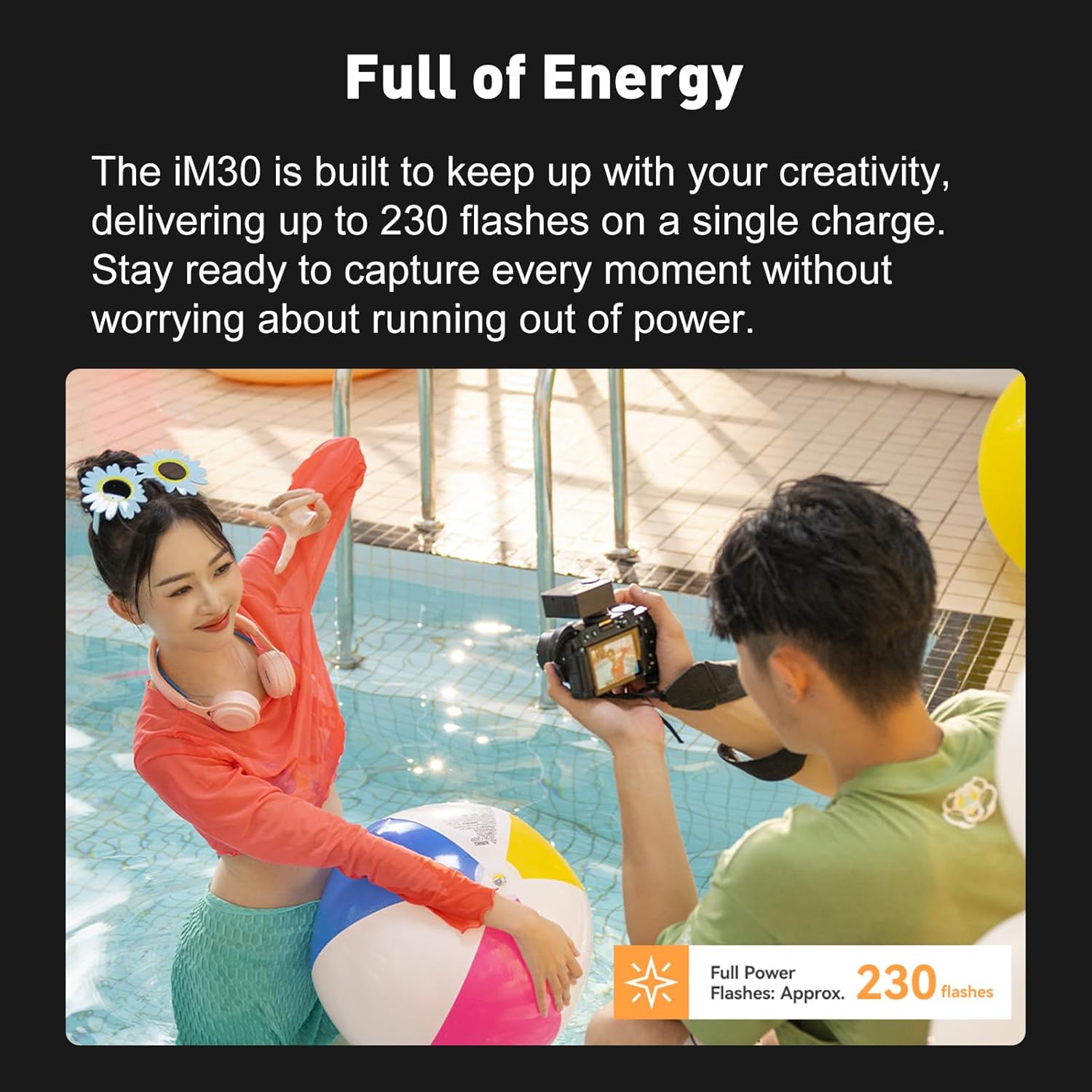 - The on-camera iM30 Mini Flash from Godox is perfect for those who want a simple lighting solution. With a minimalist design, this fully-manual flash is compatible with a variety of camera models with a universal hot shoe. The iM30 offers a guide number of 49.2' at ISO 100 and features a fixed head with a daylight color temperature of 6500K. The flash's output level can be manually adjusted from 1/64 to full power in seven steps. This compact unit is capable of delivering 230 full-power flashes and will recycle in 3.6 seconds. The iM30 is a great tool for photographers working on small product shots or portraits. It is worth mentioning that its elegant design will visually add to the aesthetics of your camera. A key benefit is the flash's highly portable, elegant body that can be taken or stored anywhere.