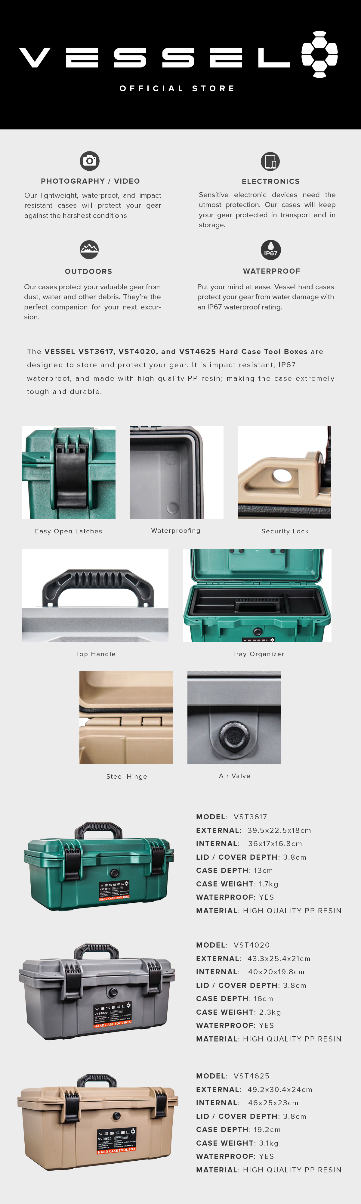 - The VESSEL VST3617, VST4020, and VST4625 Hard Case Tool Boxes are designed to store and protect your gear. It is impact resistant, IP67 waterproof, and made with high quality PP resin; making the case extremely tough and durable.