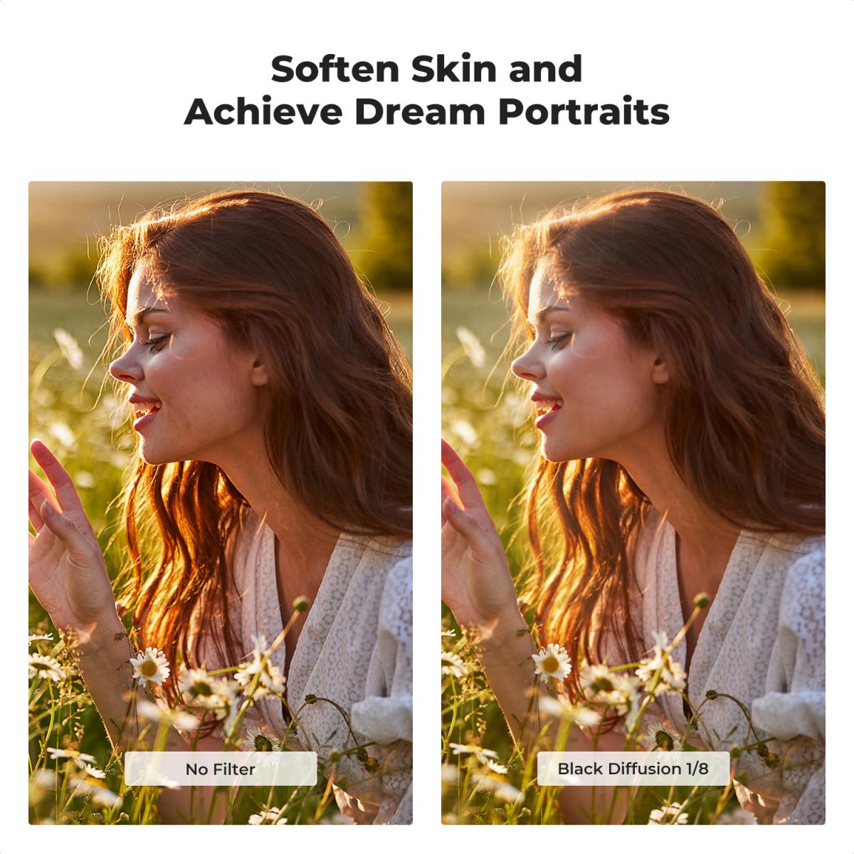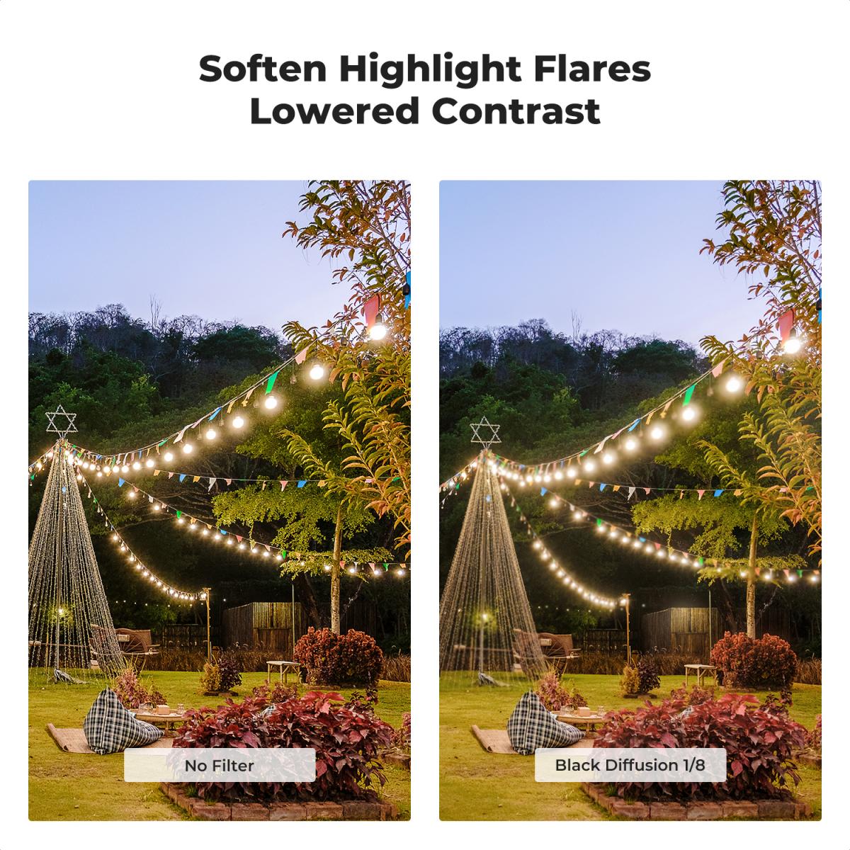 - Beautiful, gentle diffusion around light sources. 1/8 Black diffusion filter can soften the wrinkles, spots, pores, etc. of the human skin, and better realize the dreamy, hazy movie effect.