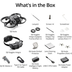 • Safely film steady, ultra-wide 4K stabilized video indoors or outside, in and around objects, with the DJI Avata Explorer Combo FPV Drone with Goggles Integra. Sporting what some call a "cinewhoop" design, the Avata comes in a palm-sized form factor with all four propellers protected with attached guards. This allows for close-up filming indoors, near people, and through small openings without risking damage or injury to people and property. If the Avata does come in contact, it can just bounce off and keep flying.