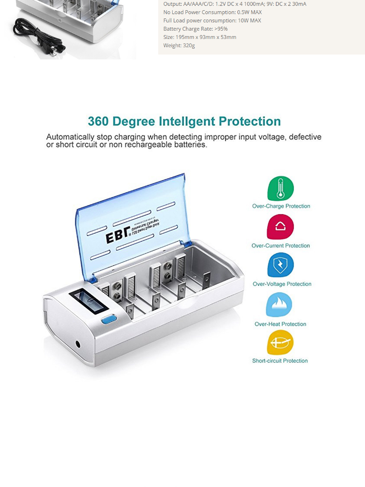 - Automatically stop charging when detecting improper input voltage, defective or short circuit or non rechargeable batteries.