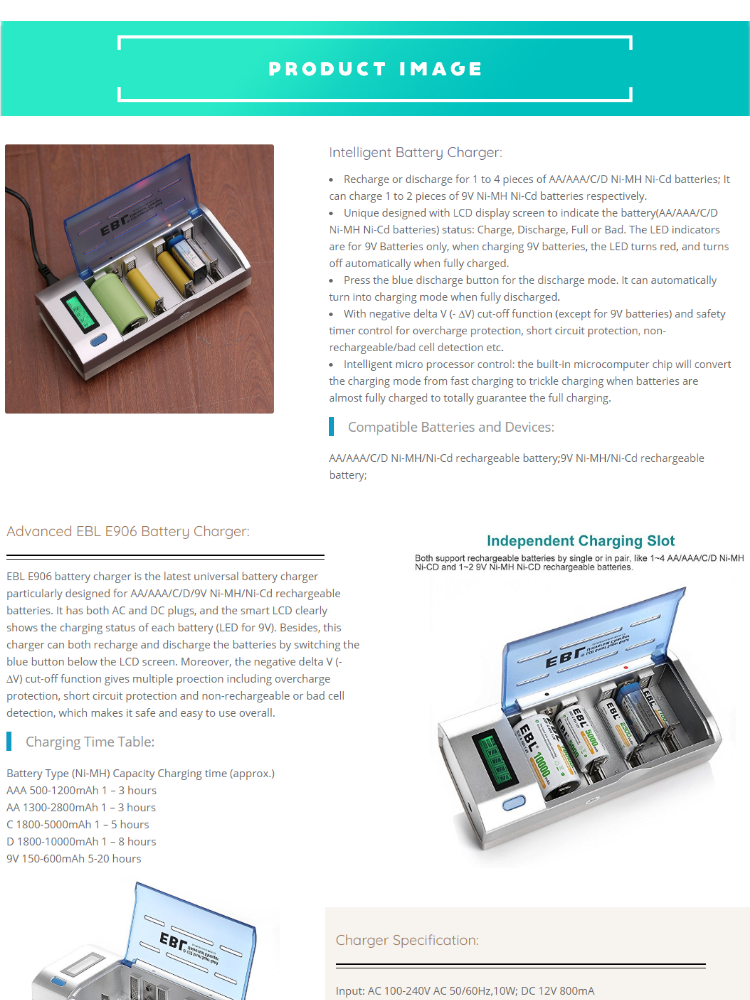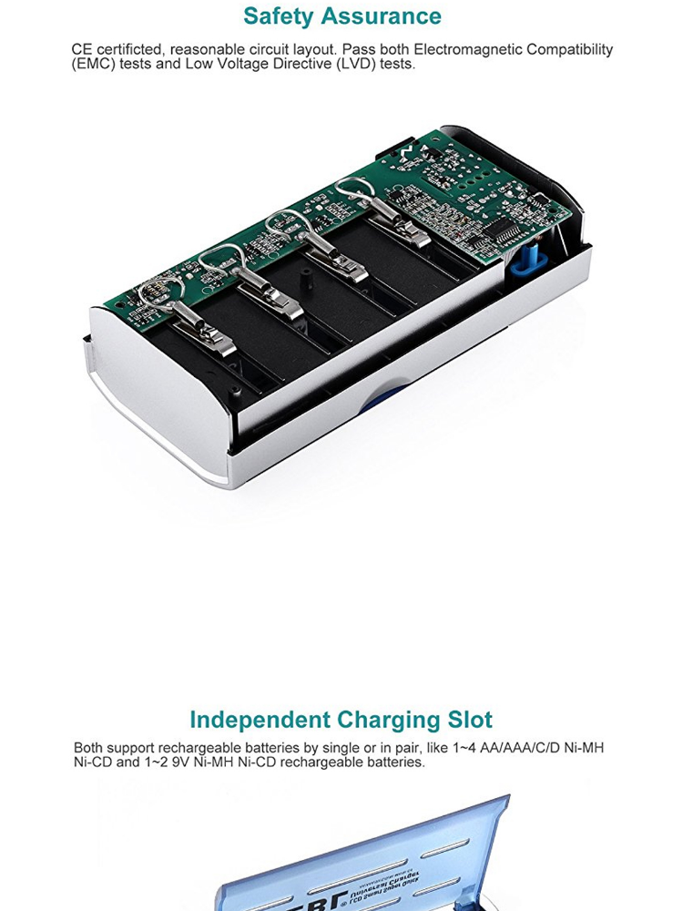 - Ultra compatible 1-4 AA/AAA/C/D and 1-2 9V Ni-MH/Ni-Cd rechargeable batteries, independent charging slot, can charge different size batteries freely.
