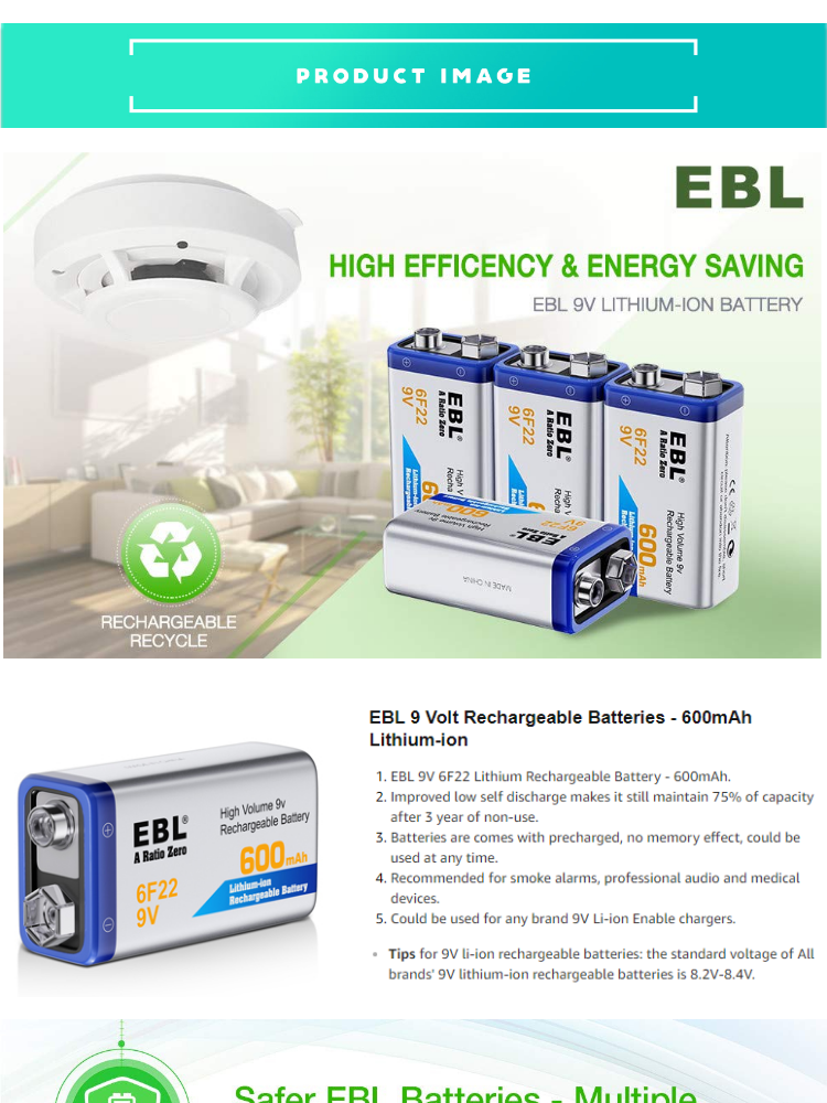 EBL 9V 600mAh Rechargeable battery - Lithium Ion