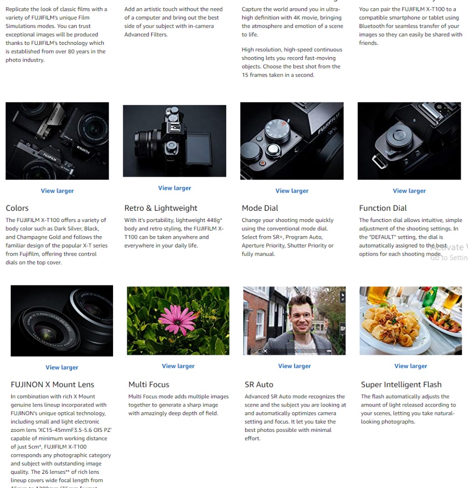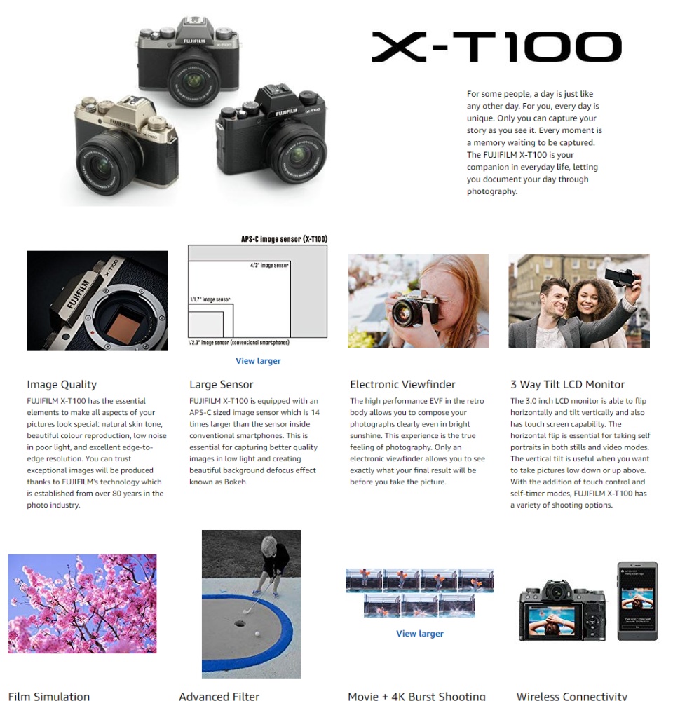 • 24.2 Megapixel APS-C size sensor with Color Reproduction technology refined over 80 years. Artistic expression are made easy with the x-t100 with film Simulation and advanced filter modes