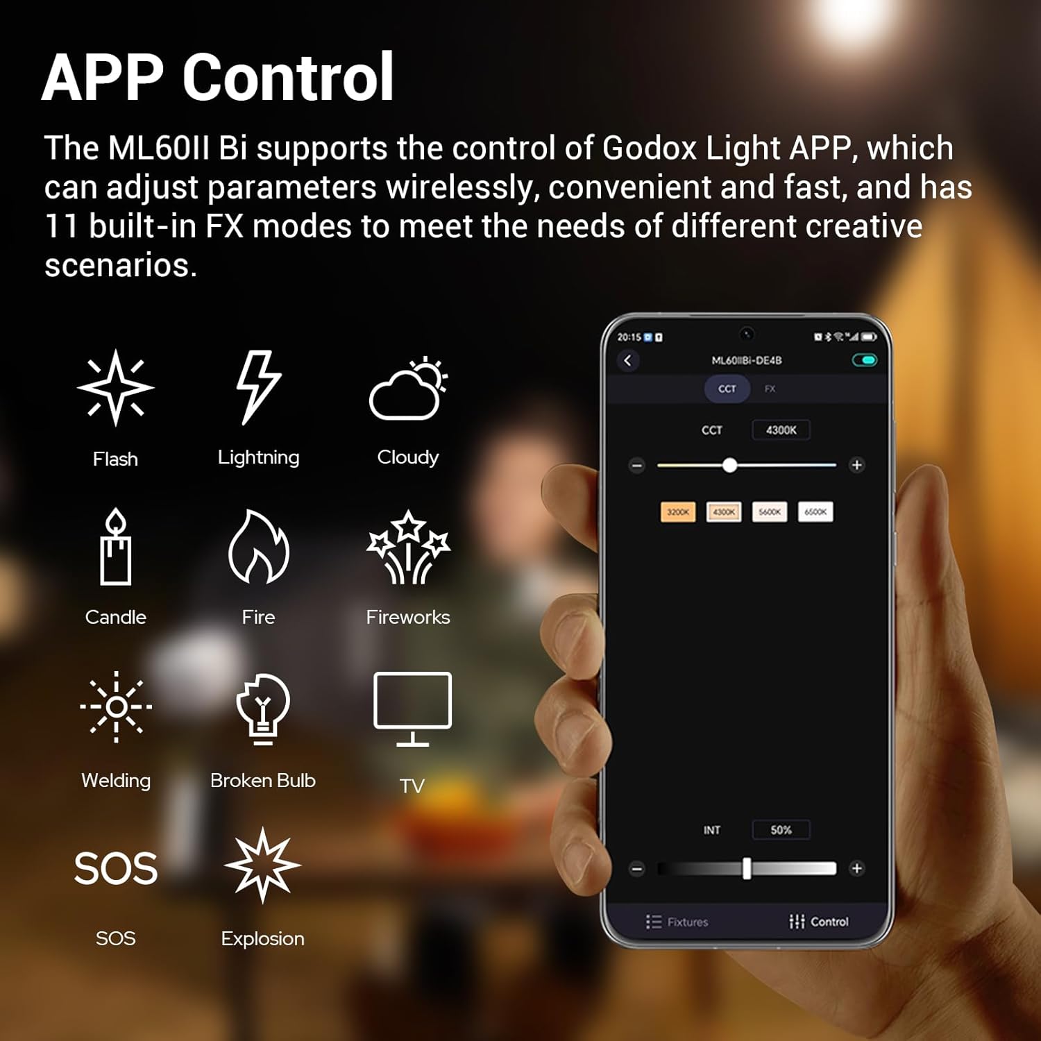 - Godox expands its LED monolight line with the ML60IIBi Bi-Color LED Monolight . Featuring a flattering white housing, the ML60IIBi offers the bi-color flexibility of the previous ML60Bi packed into a compact and highly portable fixture designed with run-and-gun shooting in mind. Ultralightweight at just 1.1 lb, the ML60IIBi allows quick setup and operation, even one-handed. Other benefits are AC or battery power options for studio or location work, plus a wide array of separately available accessories. Wherever you go, the ML60IIBi provides a bright output and dynamic effects to your shots.