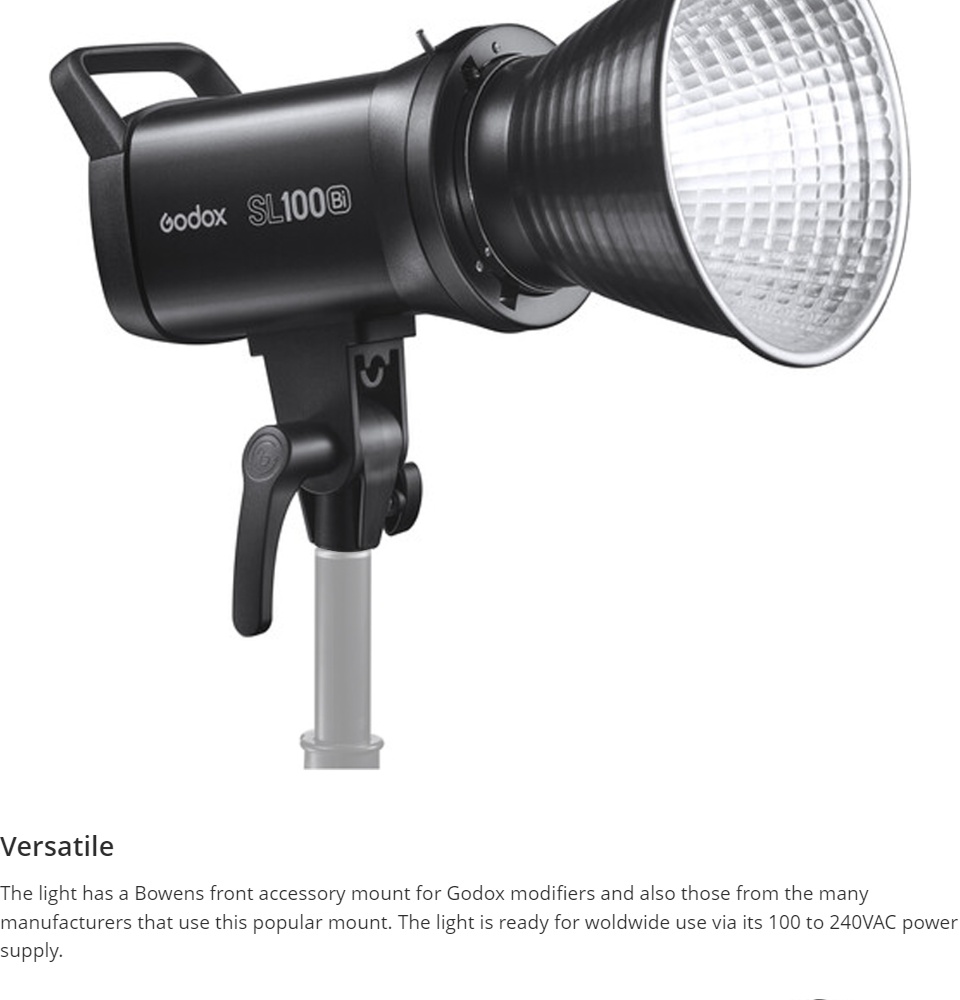 - Versatile - The light has a Bowens front accessory mount for Godox modifiers and also those from the many manufacturers that use this popular mount. The light is ready for woldwide use via its 100 to 240VAC power supply.