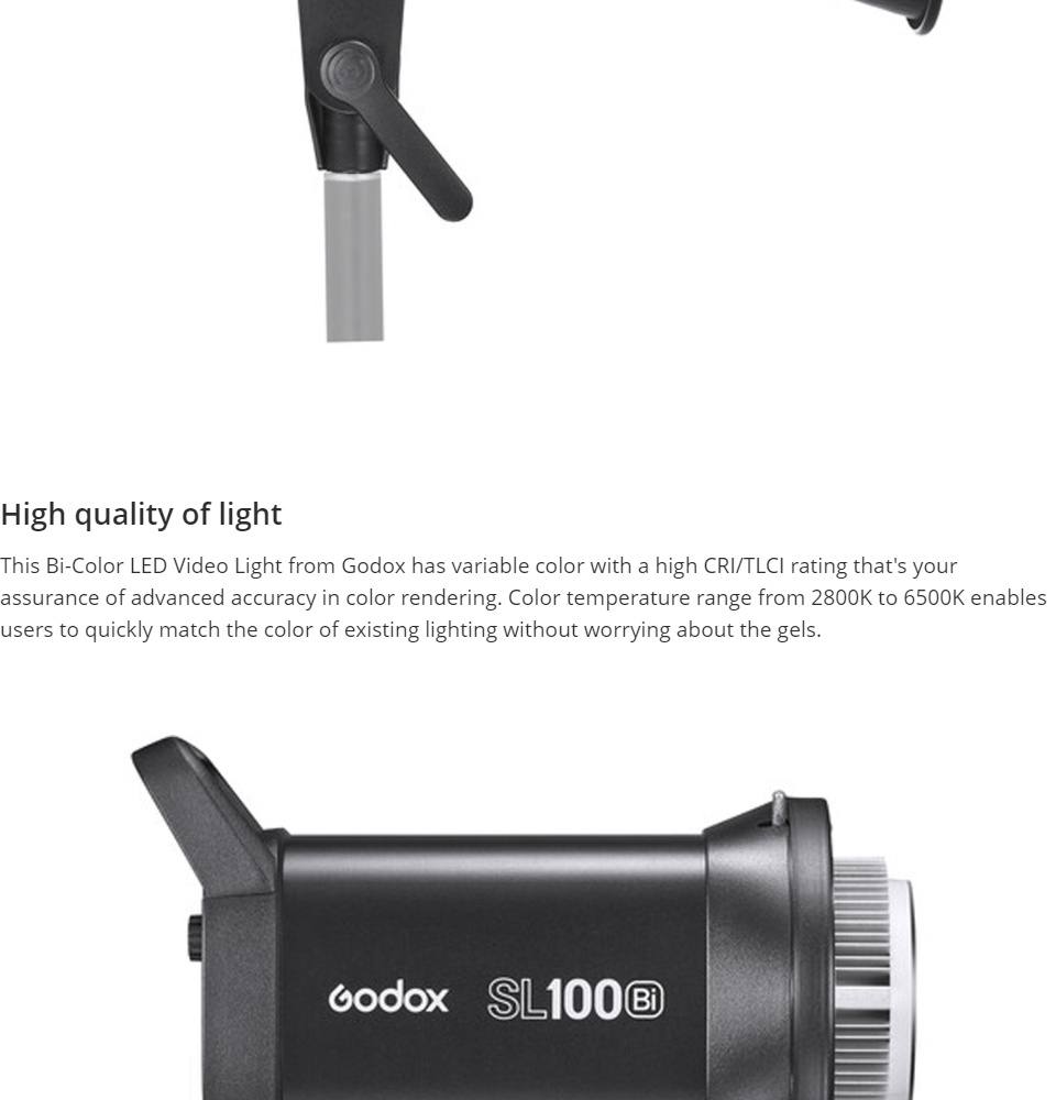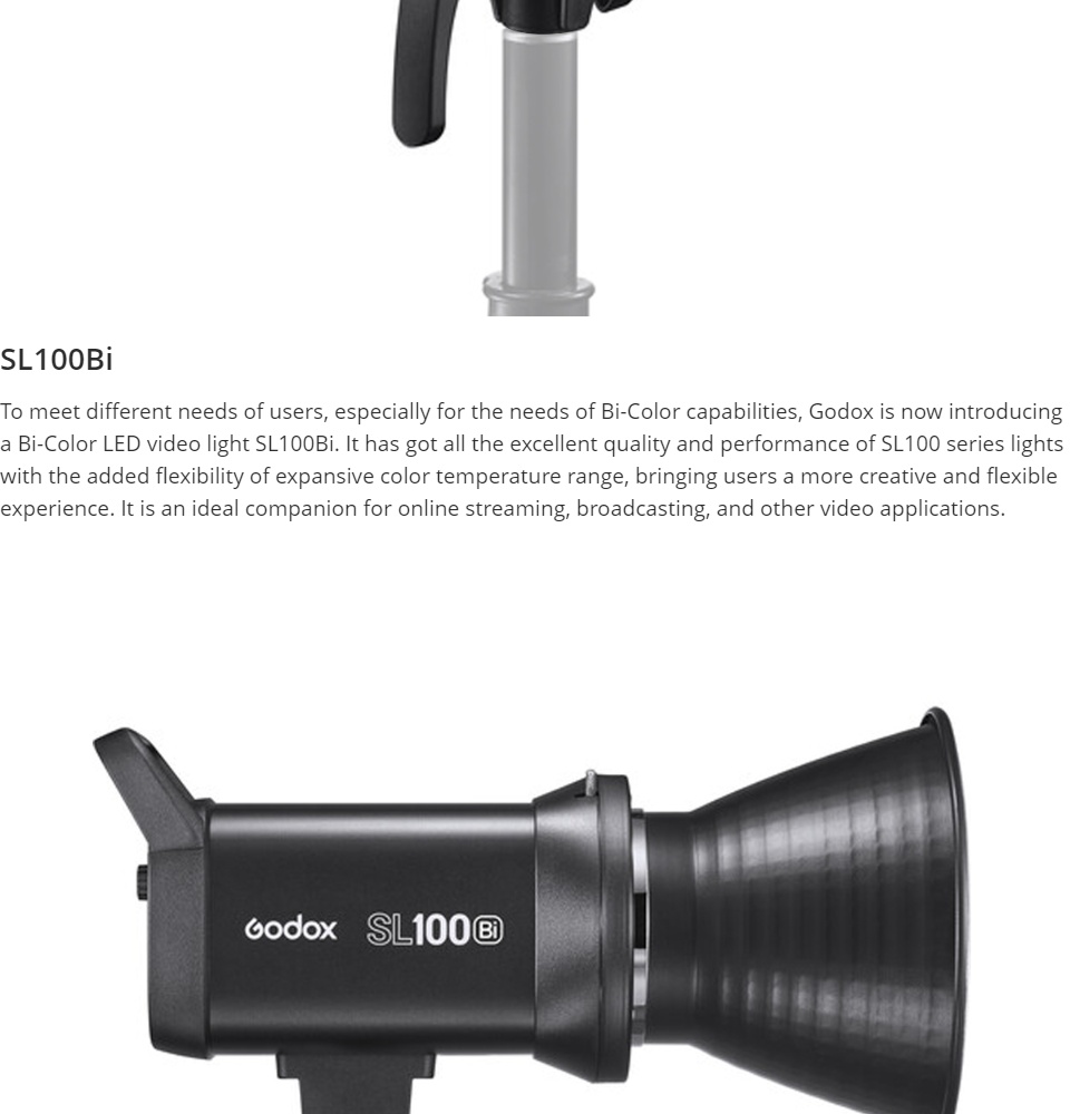 - SL100Bi - To meet different needs of users, especially for the needs of Bi-Color capabilities, Godox is now introducing a Bi-Color LED video light SL100Bi. It has got all the excellent quality and performance of SL100 series lights with the added flexibility of expansive color temperature range, bringing users a more creative and flexible experience. It is an ideal companion for online streaming, broadcasting, and other video applications.