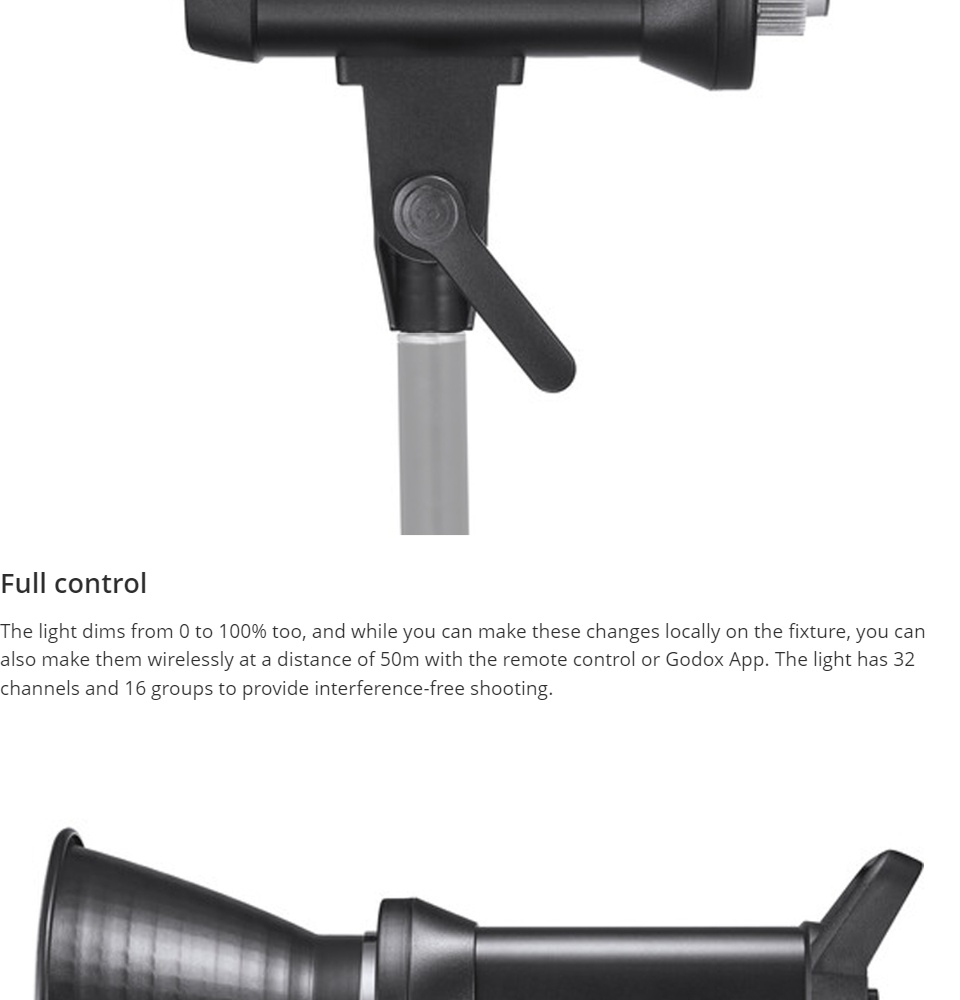 - Full control - The light dims from 0 to 100% too, and while you can make these changes locally on the fixture, you can also make them wirelessly at a distance of 50m with the remote control or Godox App. The light has 32 channels and 16 groups to provide interference-free shooting.