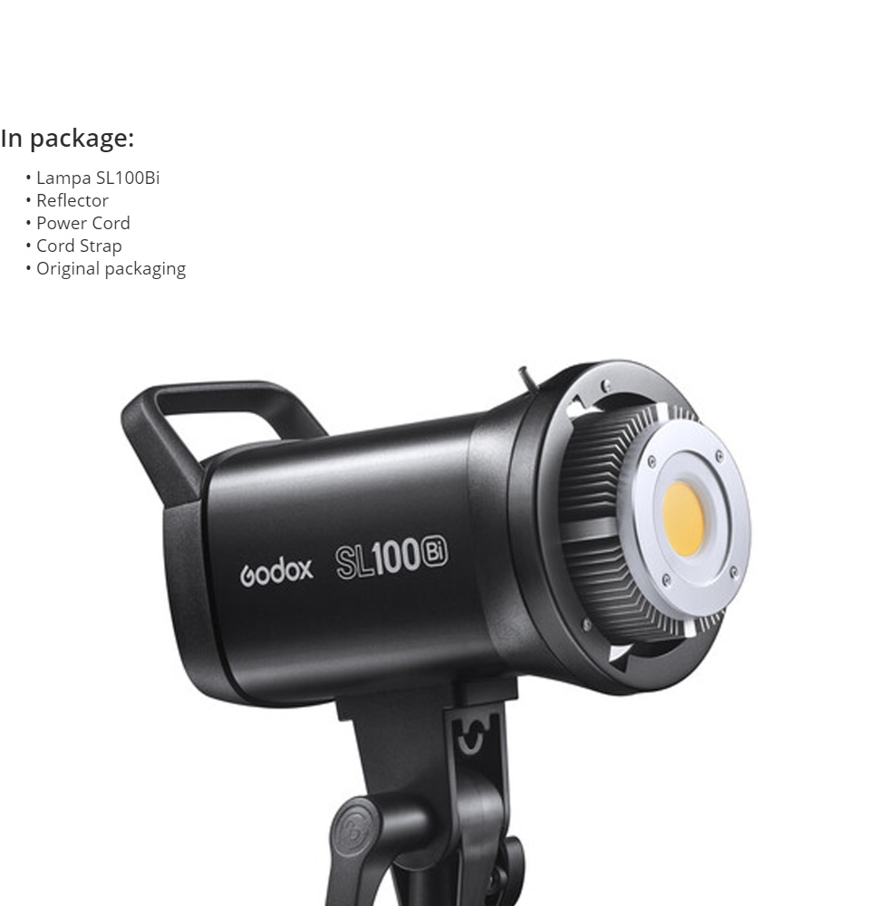 - In package: Lampa SL100Bi, Reflector, Power Cord, Cord Strap, Original packaging