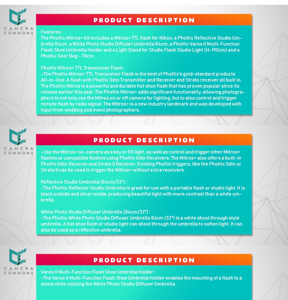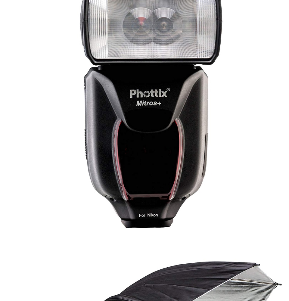 - The Phottix PH80374 Mitros+ TTL Transceiver Flash Kit for Nikon Cameras features the Mitros+ TTL flash for Nikon, a 33" reflective studio umbrella, a 33" white photo studio diffuser umbrella, a Varos II multi-function flash shoe umbrella holder, a 6.2' light stand for studio flash light, and a 27.5" bag to carry the equipment