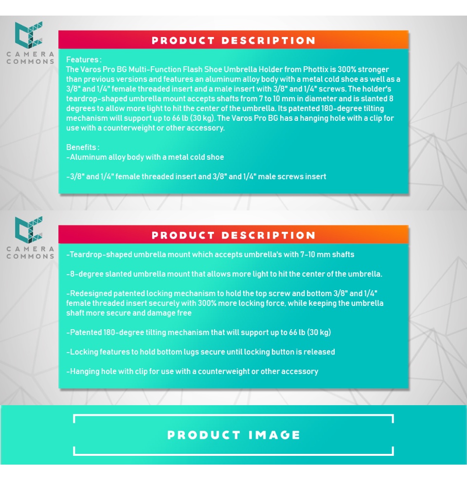- The redesigned Phottix Varos Pro BG’s patented locking mechanism to hold the bottom 3/8”and 1/4” female threaded insert security with 300% more locking force. The patented 180 degree tilting mechanism supports up to 30 kg. New locking features holds bottom lugs secure until locking button is released. Included is a hanging hole and clip included for use with a counter weight or other..