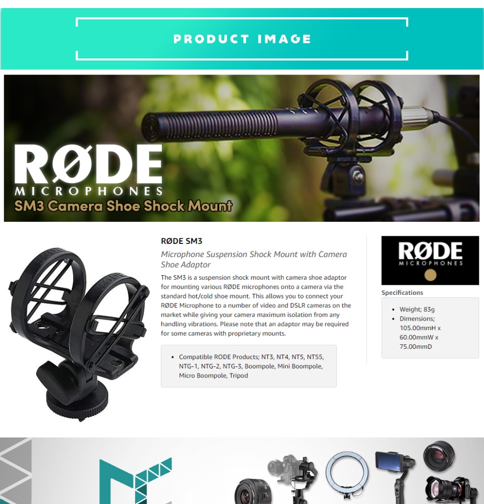 - The SM3 is a suspension shock mount with camera shoe adaptor for mounting various RØDE microphones onto a camera via the standard hot/cold shoe mount. This allows you to connect your RØDE Microphone to a number of video and DSLR cameras on the market while giving your camera maximum isolation from any handling vibrations. Please note that an adaptor may be required for some cameras with proprietary mounts.