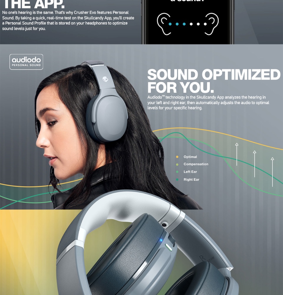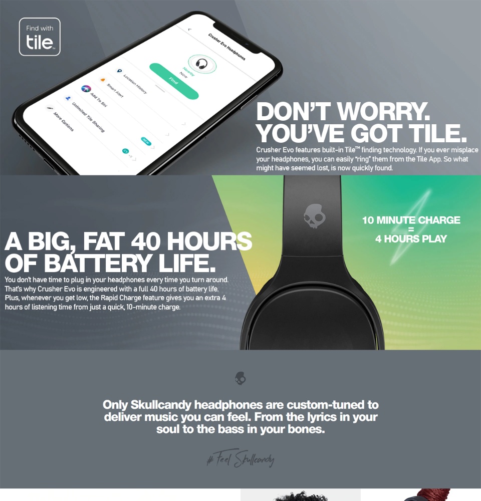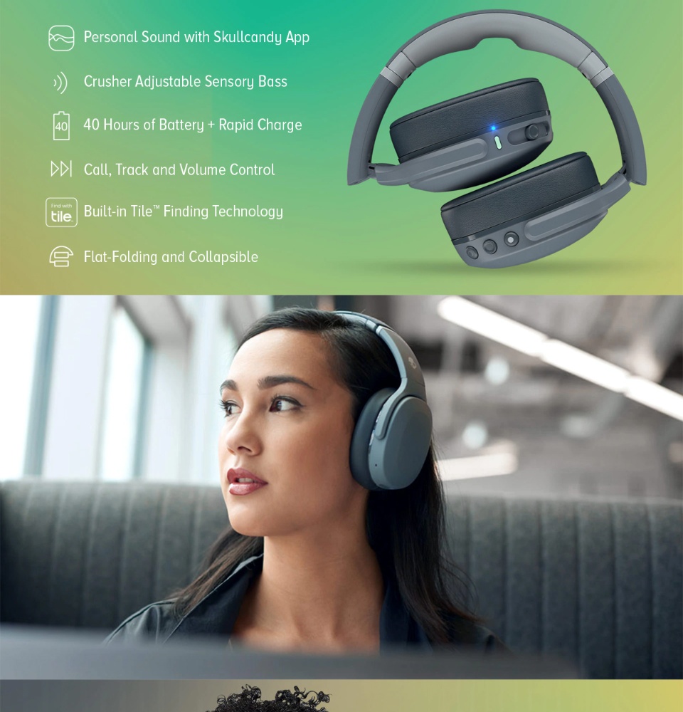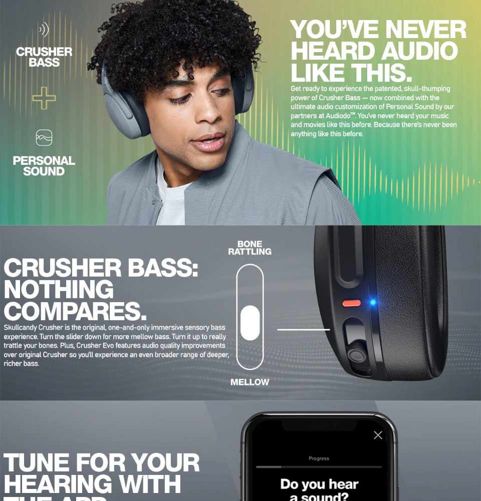 - Feel the bass in your bones with Crusher® Evo — the latest advancement in the famous Skullcandy® Crusher line. Patented Adjustable Sensory Bass technology is an experience that you can’t get in any other headphones. And now, you can even customize the sound to your unique hearing through a quick audio test in the Skullcandy App. So you’ll hear the music exactly the way it was meant to be heard. Critical controls — call, track change, volume, and Crusher Bass — are conveniently located with easy-to-use tactile buttons. Tile® finding technology lets you “ring” your headphones if they’re ever lost or misplaced, so you’ll never return home without them. Rapid Charge capability provides 4 hours of listening time on just 10 minutes of charge, and a full charge lets you feel the music for an amazing 40 hours. Crusher Evo is also travel-ready. It folds flat to fit perfectly into the included travel case.