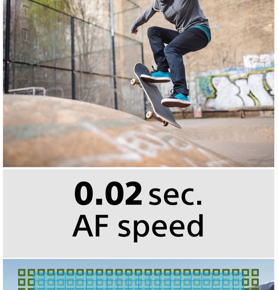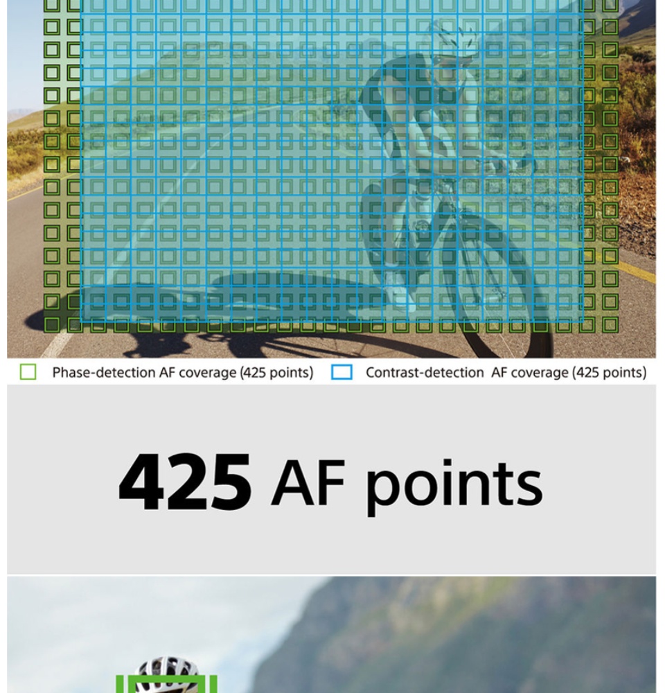 Covering nearly the entire sensor area, a powerful 4D FOCUS system incorporates 425 on-chip phase-detection points along with 425 contrast-detection areas for precise focusing in as little as 0.02 seconds. The density of focusing points from this hybrid AF system also enables High-density Tracking AF Technology, which is adept at tracking moving subjects in a variety of lighting conditions. Real-time Eye AF can be used to base focus on recognized subjects' eyes for portraits (either humans or animals) and is available for both AF-S and AF-C modes, for stills or video. The use of phase-detection points also enables the use of A-mount lenses via the optional LA-EA3 or LA-EA1 lens mount adapters with full AF compatibility.