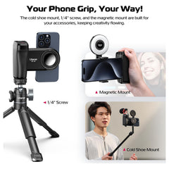 - Your Phone Grip, Your Way: The cold shoe mount, 1/4" screw, and the magnetic mount are built for your accessories, keeping creativity flowing.