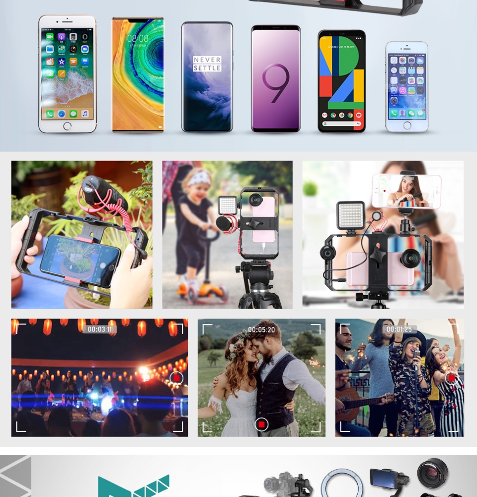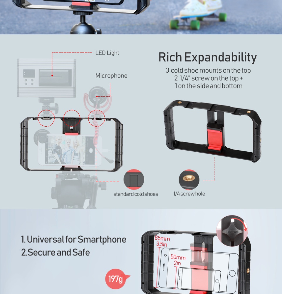 - Professional video rig for smartphone whose width is within 2.1-3.3"
