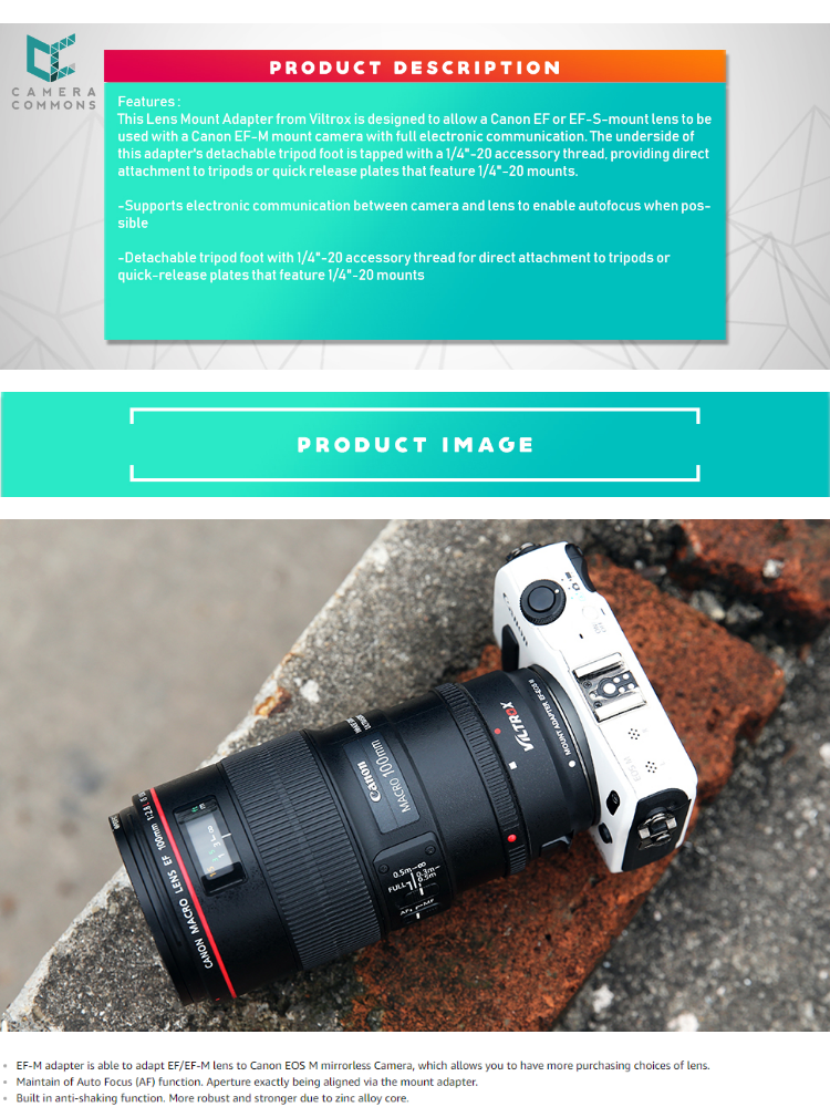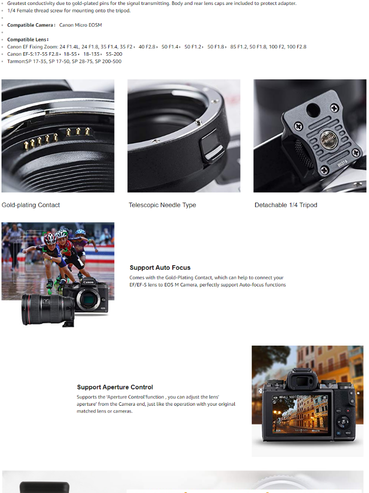 - Allows Canon EF and EF-S lenses to be mounted on the Canon EOS M Compact System digital camera