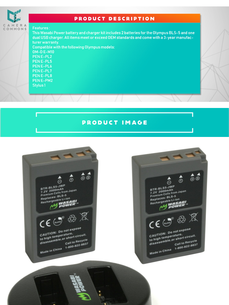 - This Wasabi Power battery and charger kit includes 2 batteries for the Olympus BLS5, BLS1 and one dual USB charger. All items meet or exceed OEM standards.